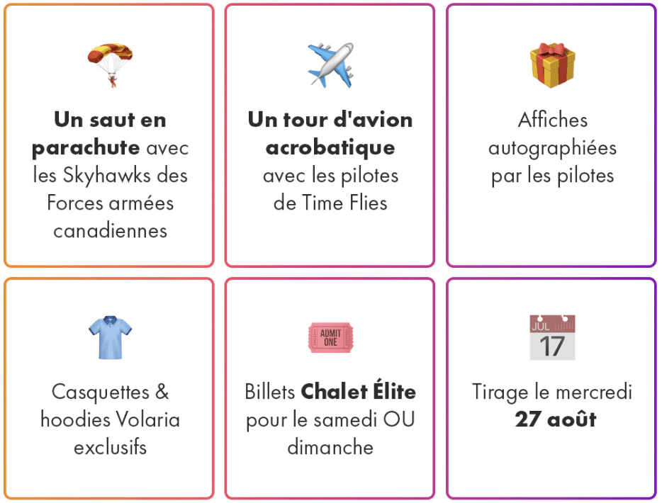 Le festival aéronautique Volaria est de retour, et cette année, on vous fait DÉCOLLER pour vrai ! Vous avez toujours rêvé de voler tête en bas ou de sauter dans le vide ? Participez à notre concours GRATUIT et vivez des expériences aériennes hors du commun.